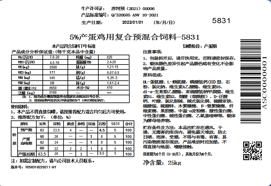 农信优选-苏州安佑5%产蛋鸡用复合预混合饲料-25kg/袋